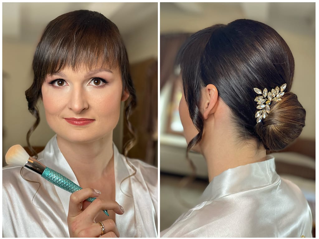 Upięcie włosów/ loki/ fale oraz pełny makijaż ślubny wraz z korektą i subtelnym rozświetleniem dekoltu. W cenie kępki rzęs, próbka pomadki i pudru w dniu ślubu dla Panny Młodej