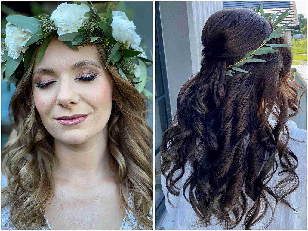 Upięcie włosów/ loki/ fale lub pełny makijaż ślubny dla panny młodej wraz z korektą i subtelnym rozświetleniem dekoltu. W cenie kępki rzęs, próbka pomadki i pudru w dniu ślubu dla Panny Młodej
